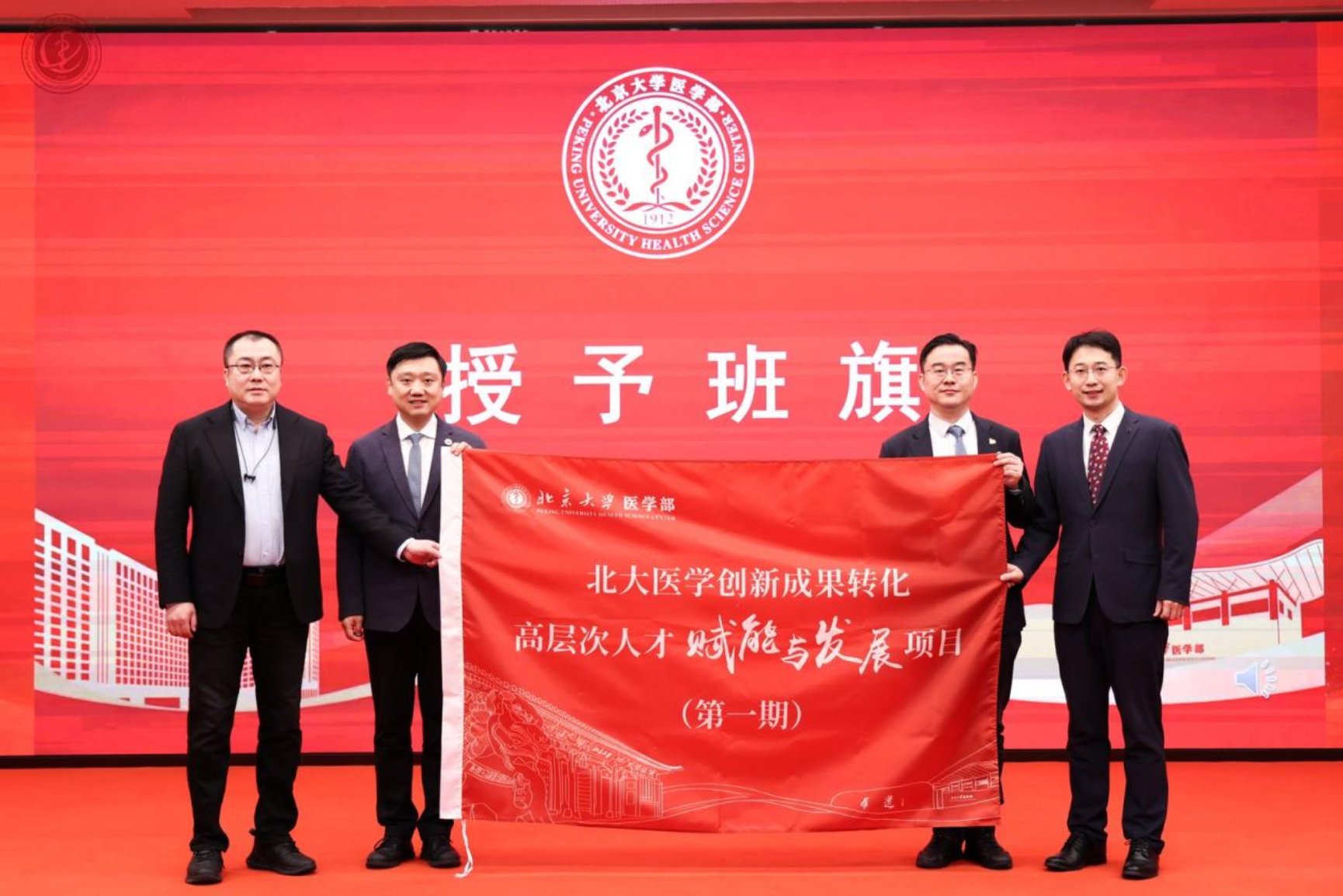 仪式现场,北京大学医学部副主任肖渊与首颐医疗集团副总经理李明共同向学员代表孙浩林、汪磊授予班旗,期许大家以旗为勉,传承与传递北大医学人创新使命。