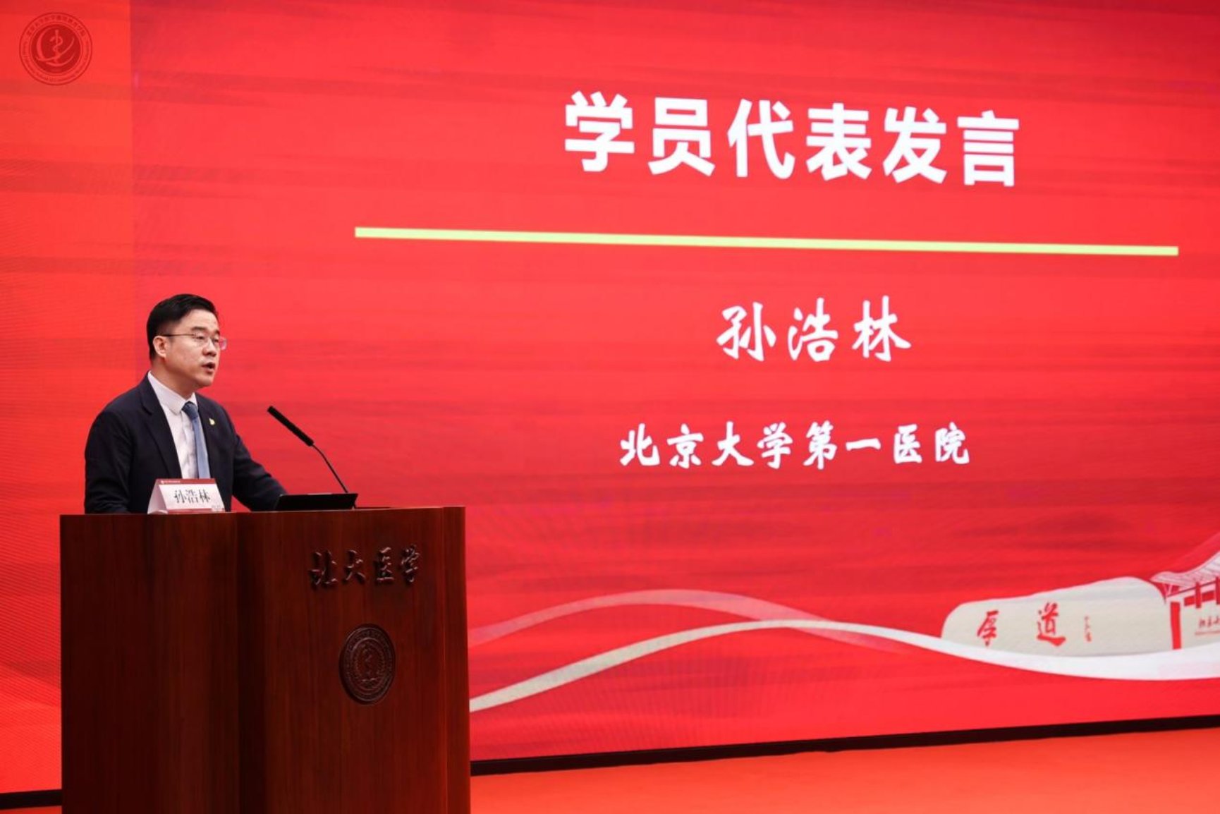 学员代表,北大医学创新转化一等奖获得者,来自北京大学第一医院的孙浩林结合自身临床实践与科研转化经历分享体会。他在实践中深刻感受到“真正的转化是让每一项技术都精准回应临床需求”,呼吁全体学员凝聚合力,打破壁垒,推动更多原创医学科技成果转化项目落地生根,共筑北大医学创新转化新高地。